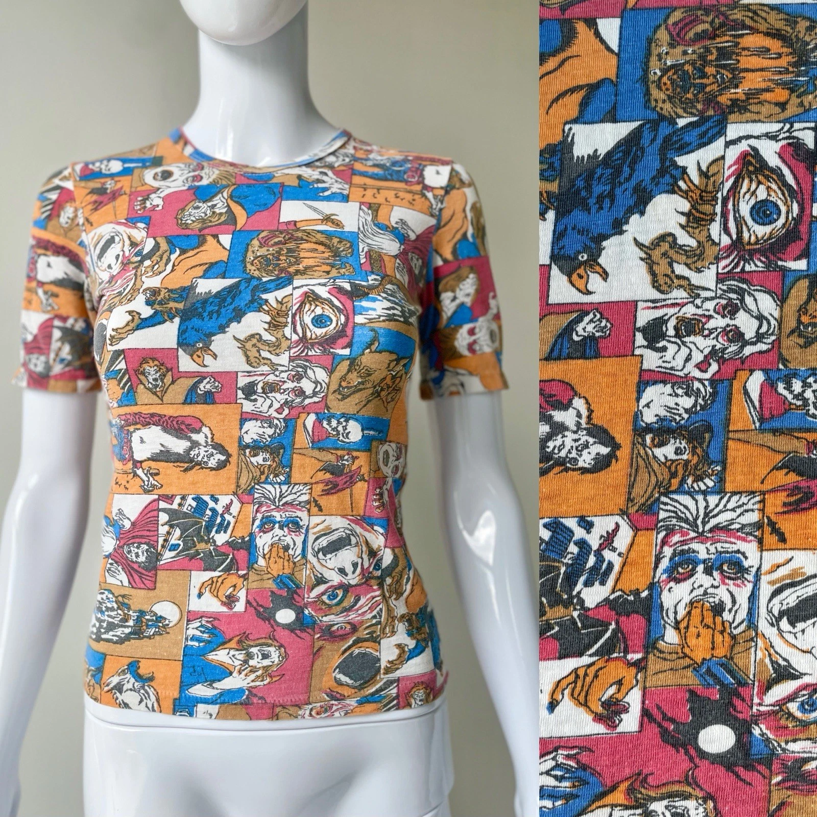 I have never seen this wonderful horror shirt from the early 70s, and it took me like three passes to even notice the Morbius from the Spider-Man comic swipe. It’s like walking around with every “Night Gallery” on your chest….
