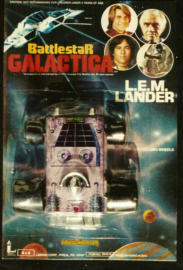 At first glance the Larami L.E.M lander looks more logical, almost in synch with the series. I mean these guys packaged EVERYTHING under the BSG banner save for sewing sets including jets, yes just plain ordinary fighter planes. However, the L.E.M lander is just a repackaged moon landing toy and has absolutely nothing to do with the series. So, the track record is flawless…