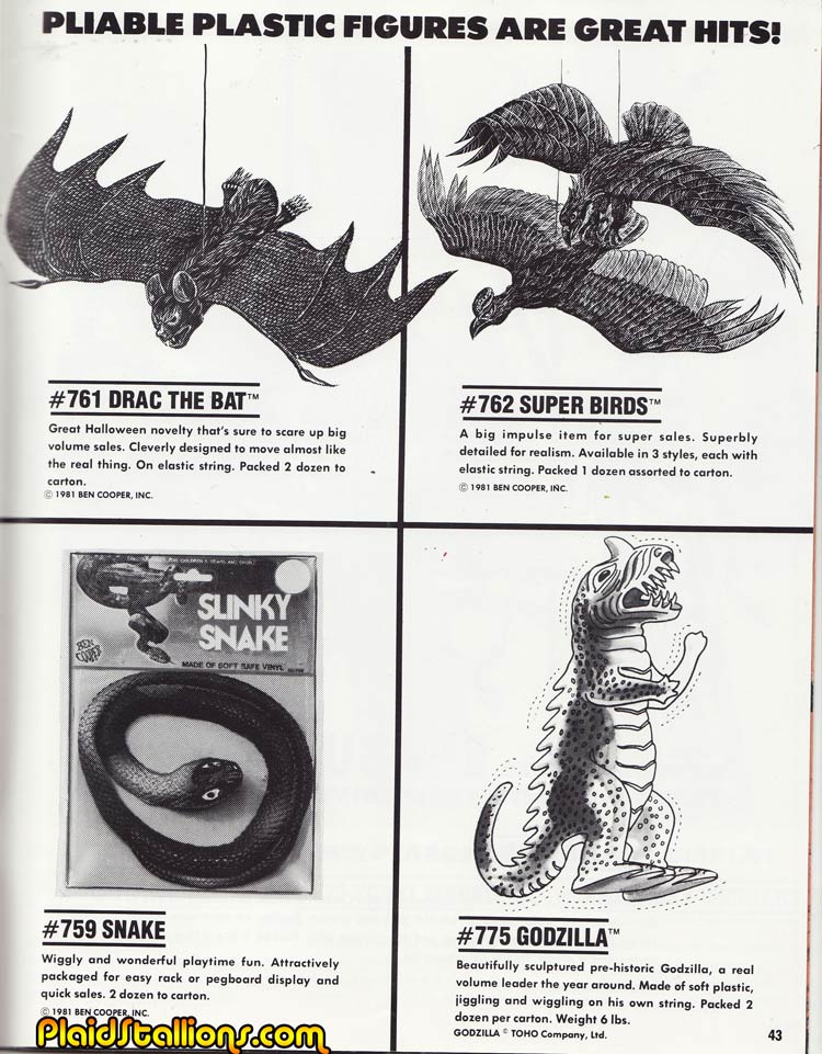This stuff always robbed me of any pocket change, I was a real mark for it. Cooper got a lot of mileage out of these Jigglers. Doctor Strange is absent from this year's lineup. Looks just like Godzilla? <--previous • index • next Page-->