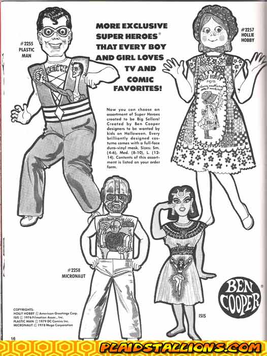 Isis and Plasticman were still TV stars in 1980 while Holly Hobbie and Biotrion from the Mego Micronauts were stars of the toy aisle. I seem to recall a Baron Karza costume as well, I could be wrong.