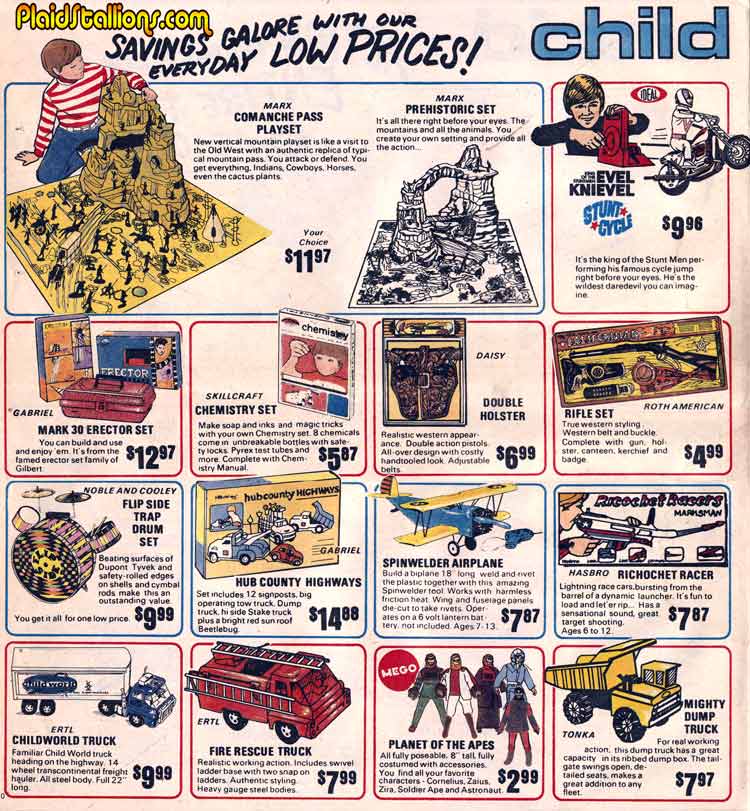 Evel Knievel was still a super hot toy in 1975 and surprisingly the Mego planet of the apes dolls still sold despite the series getting cancelled almost a year earlier..