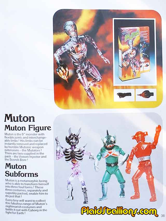Denys Fisher Muton Back • INDEX • Next--> Muton, besides his "Venom Injector", the big baddie had "Sub Form" costumes which were actually suits from the Japanese "Henshin Cyborg" line of toys. One of them is a TV character named "Red Baron" who was a good guy on Japanese TV Screens..
