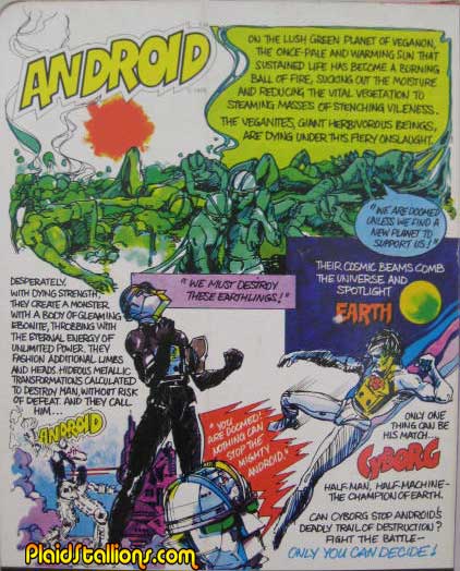 According to his comic, Android was created by the dying race "The Veganites" who are good at building weapons of mass destruction but bad at naming things. Like mankind didn't have enough problems already, the Android's mission is to destroy mankind.