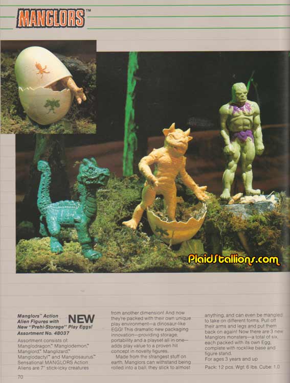 Here we have Manglodragon, Manglodemon and Manglord, who is in charge I guess. The catch phrase here was "made from the strangest stuff on earth", as I recall it also had a weird smell. Each of the figures came in a "Prehi-Storage" Play Egg in 1984, although figures also came in window less boxes with stands. One of the biggest problems with the line was kids wanted to test the amazing claims made in the commercial while they were in store, resulting in a lot of damaged goods.: