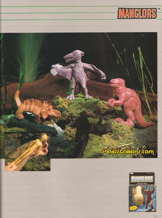 Manglors were a pretty interesting concept from Ideal and one you remembered seeing, first, everybody in the line was a monster, which is cool in itself. Secondly the concept was that you hatched the figures from their eggs and then you could stretch, squeeze and even rip the body parts off the figures and attach them to other figures. An organic version of the micronauts I guess.