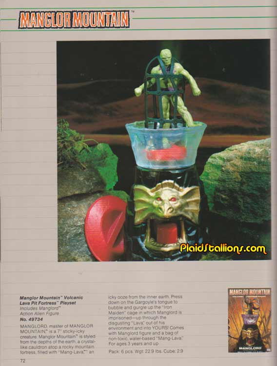 Manglor Mountain seemed to be a pit of "Lava" (very close to Mattel Slime) and you raised Manglord up and down into it using an Iron Maiden like device. Not sure if you were helping him or torturing him here, it didn't matter, it all resulted in some carpet staining, I am sure..