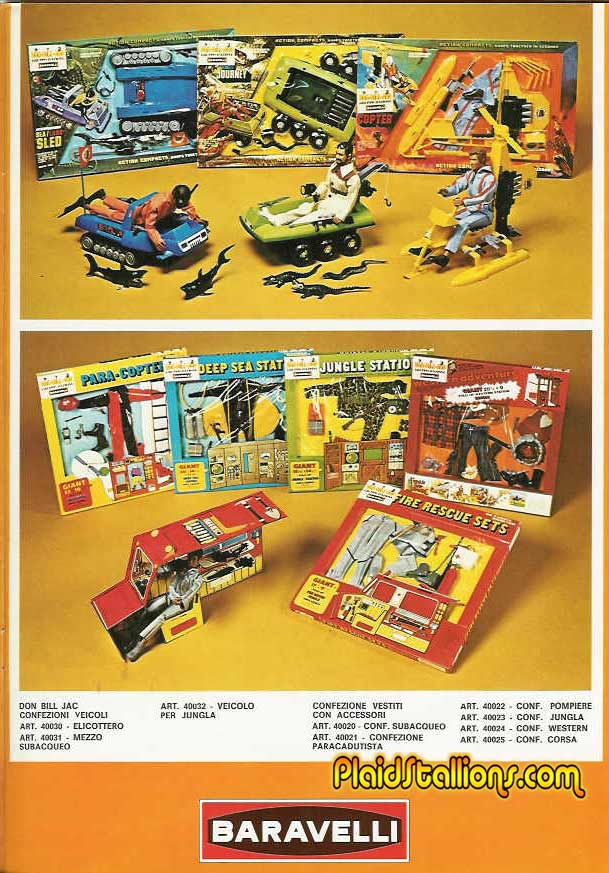 If you've never heard of the toy line yet it looks oddly familiar to you at the same time, there is good reason for that. Don Bil Jac was only sold in Italy by a company called Baravelli but it is a clever repackaging of a toy line known to North American kids as "Mr Action" (more on him soon). The results are really quirky and fun, enjoy the 1975 Baravelli "Bill Jac Don" catalog: