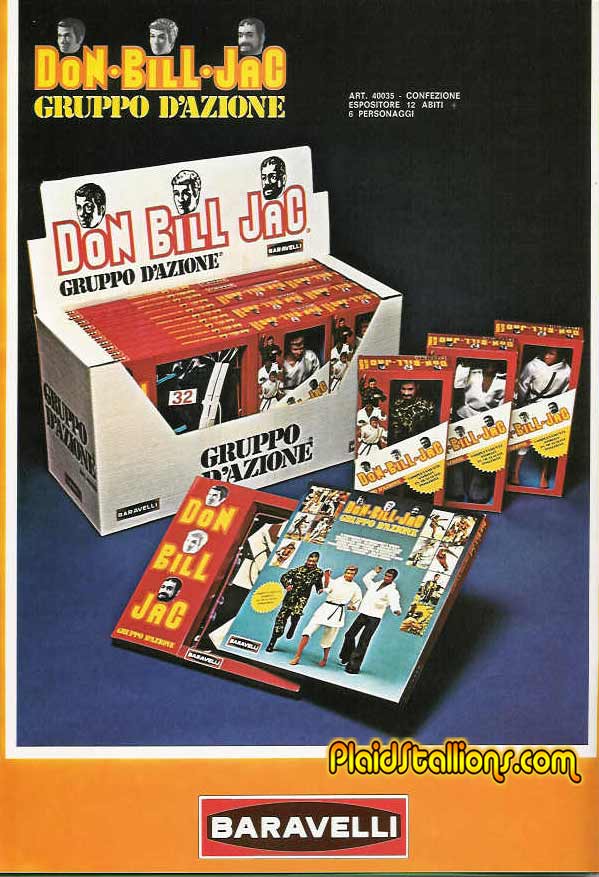 The three basic figures, Jac the G.I. Joe clone, Bil the Martial Arts expert and Don, the um.....black guy. I'm sure he's a secret agent or something, I just can't read Italian.