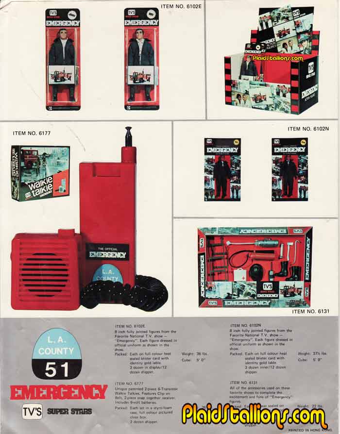 Of the two series produced this year (I'm assuming this catalog is from 1974) the bigger hit was clearly Emergency, the adventures of Gage and DeSoto lasted seven seasons (according to fans it was cancelled while ratings were soaring too) and made a generation of kids want to be fire fighters. Without a doubt, Emergency was LJN's biggest hit in the TV Superstars lineup.