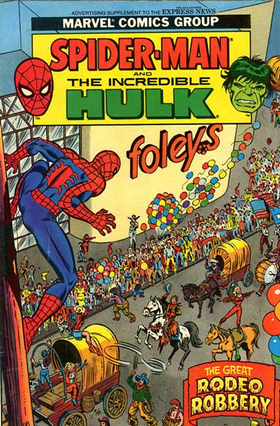 Charles also sent scans of a promotional comic given out for an appearance by Spider-Man and the Hulk. This is done for the Foley's chain of department stores. He says you can still find these in local comic stores.