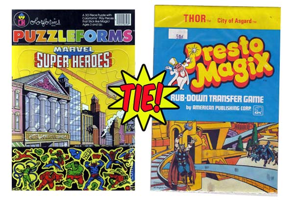 Colorforms produced some of the coolest sets for the Marvel heroes including this puzzleforms set, which featured a good chunk of the universe. On the flip side, we had Presto Magix transfer sets that gave many of the Avengers some much needed marchandise. Hours of fun, low cost and variety. That's what it's all about.