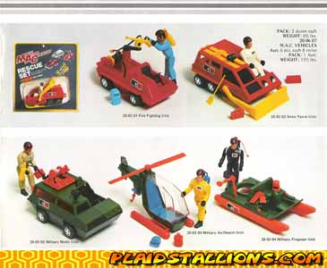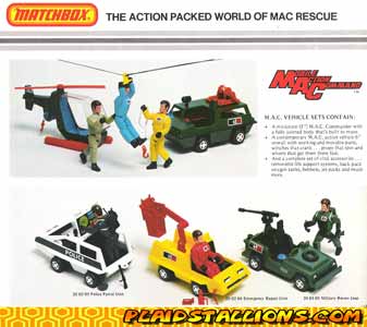 The concept is centered on the nameless men of MAC, an international rescue operation similiar to the Thunderbirds, each man has his own quasi futuristic vehicle. The combination of a 2" figure and attractively priced vehicle lured me many times and the lack of a back story intrigued me and millions of other children world wide. The thing I hear most about MAC these days from collectors is "I had that but never knew what they were called!"
