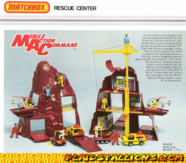 The men of Mobile Action Command were based in a secret mountain fortess complete with three vehicles and three MAC agents. This playset was the most expensive piece in the MAC aresenal and today it's not uncommon to find this piece in a department store mailer box.