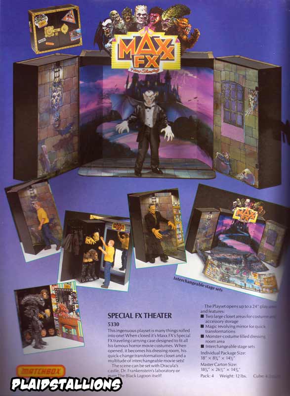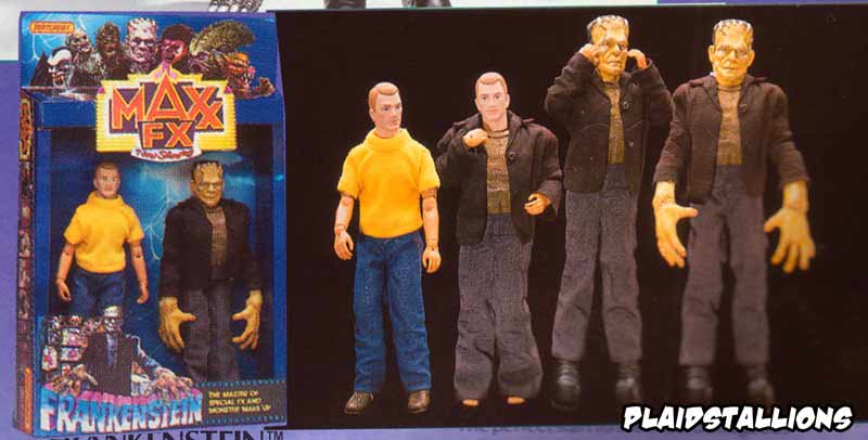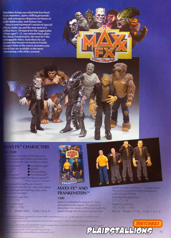 Maxx Fx was a great concept for the 80's, a 10" figure (using a Mego body no less) that could turn himself in to Movie monsters ala Captain Action. The concept might have flown much better had Matchbox not decided to use Freddy Kruger as their basic set. Parents groups were outraged at marketing such a character to children and Matchbox pulled the plug on Maxx before the other sets were even released. A true pity seeing as the next wave included a Universal version of Frankenstein and The Alien. Not pictured, but mentioned are The Creature from the Black Lagoon and Jason from the Friday the 13th series of films.