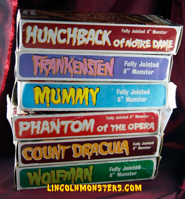 There are seven figures officially in the Monsters series (although many would argue that Mr. Rock belongs in here as well) They are: Wolfman, Phantom of the Opera, Hunchback of Notre Dame, Mummy, Dracula, Frankenstein and their girl victim which was exclusive to Spiegel. Obviously, none of these characters are licensed from Universal and are just shy of infringing on their copyrights.