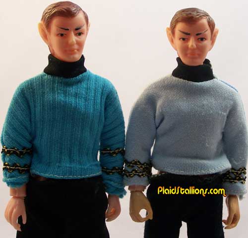 There are colour versions of Mr Rock's sweater, the one on the left is textured material while on the right is smoother and closer to a Mego Star Trek figure. I have no idea which figure came first and are equally rare at this point.