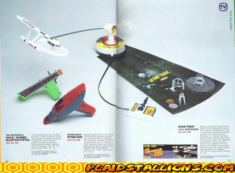 A curious hold over from the mid seventies is the CSF Starship Enterprise play set, the only Star Trek piece that Remco still seemed to carry. The Hulk and Spider-Man ray guns were still consistant sellers despite being completely without logic.
