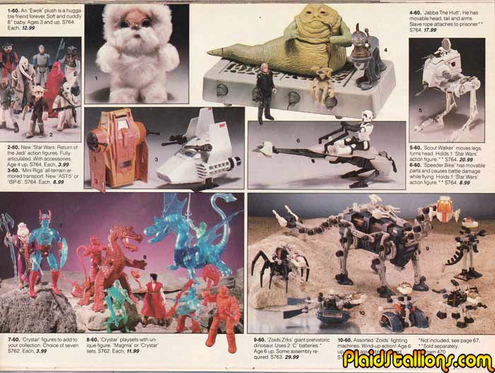 Star Wars was still kicking although Return of the Jedi wrapping up the story line seemed to take the heat off the toys. Crystar tried for some He Man money and flopped, the Zoids were a neat-o precursor to the Transformers who would arrive in 1984.