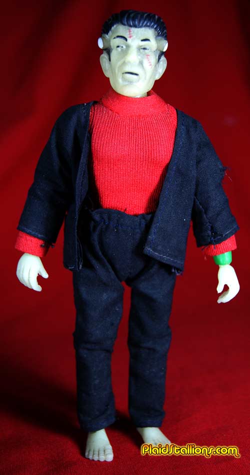 The Tomland Frankenstein figure, like all in the series is barefoot. While his outfit is pretty much the "standard Frankenstein", the loud red sweater sets it apart from the more obvious green.