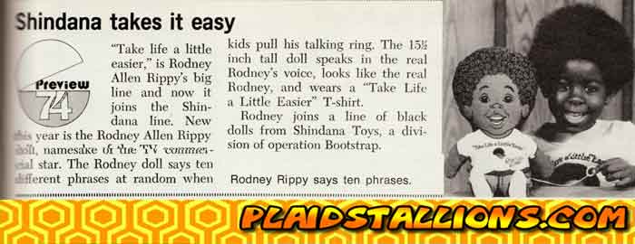 Commercial spokeskid Rodney Allen Rippey got his own doll courtesy of Shindana in 1974. Return to Plaidstallions Retro Toyfair |