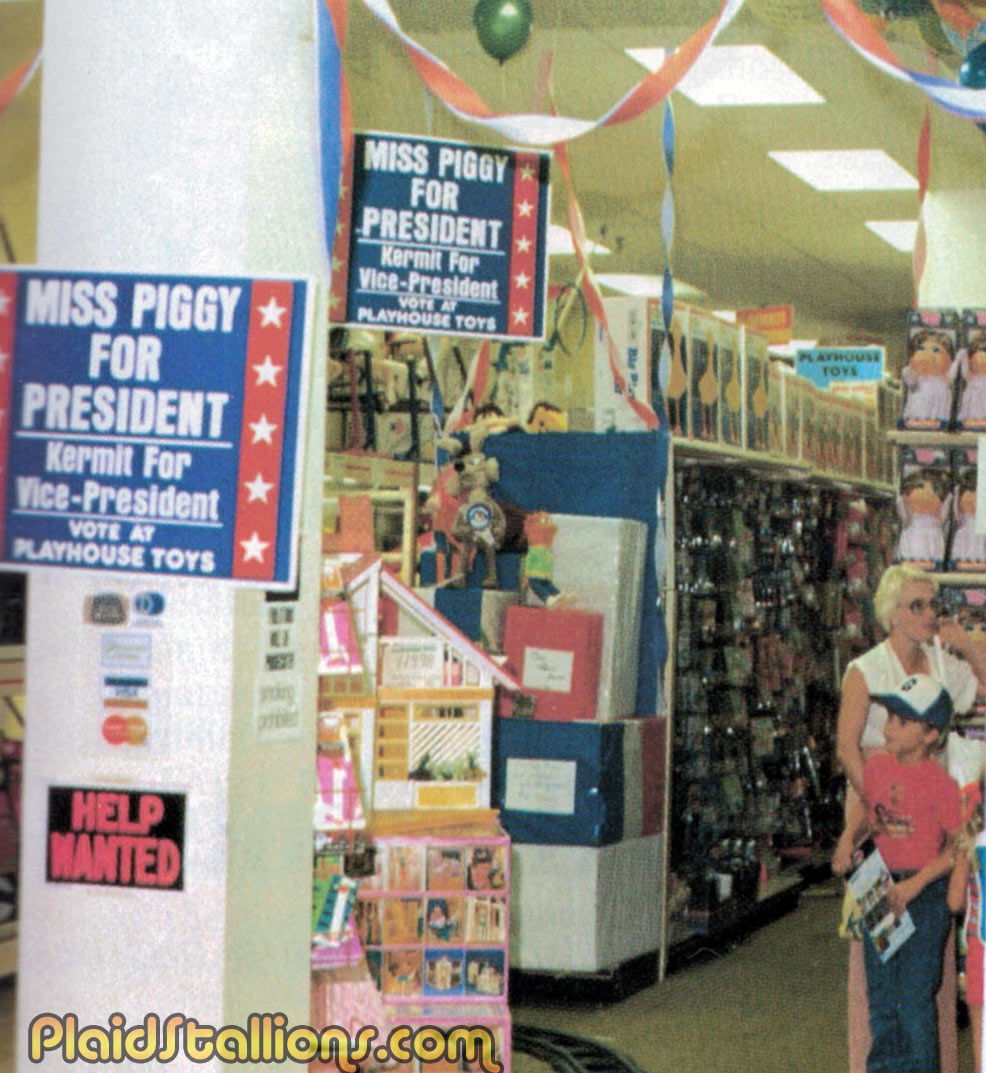 Ms Piggy herself showed up to campaign, i am sure there is good political satire here but i'm too lazy to mine it. Playhouse Toys had 15 locations in 1980, I assume all in the Lone Star state.