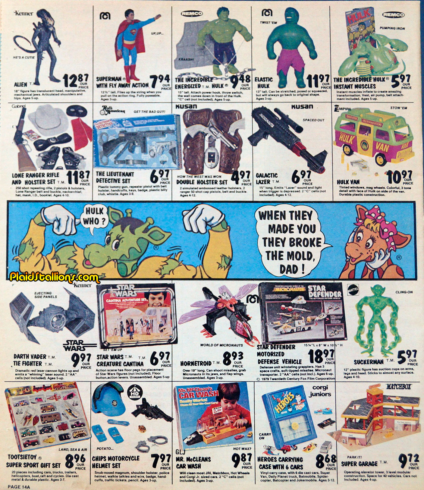 Dearest Santa, PLEASE SEND ME THIS ENTIRE PAGE! AGGGGHHHHH! So much iconic action figure goodness, Micronauts, Blue Snaggletooth cantina, Alien, Mego Elastic Hulk, Remco Hulk Muscles, I need to go lay down......