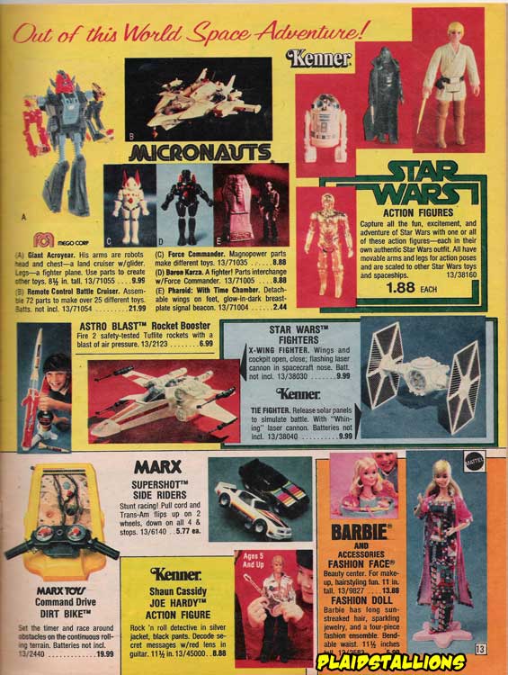 No better snap shot as to what was on the public's mind than by looking at this Catalog page. From the Mego Micronauts to budding Kenner Star Wars line, everything was getting a sci fi flavor.